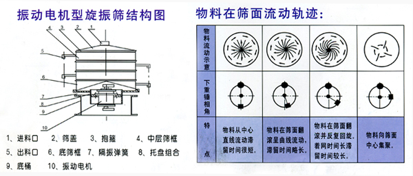 篩體的激振源裝在篩子底部,篩底之上裝有各層篩框及篩網(wǎng)架,各部件緊固后形成整體參振,參振部件由彈簧隔振支撐,物料由篩頂部中間孔給料,排料口在各層篩篩框側(cè)面,可任意改變位置??臻g相位角與篩面上物料的運(yùn)動(dòng)軌跡見(jiàn)圖示。
